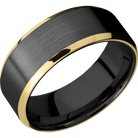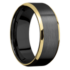 8 mm wide/Beveled/Zirconium band with two 1 mm Edge inlays of 14K Yellow Gold.