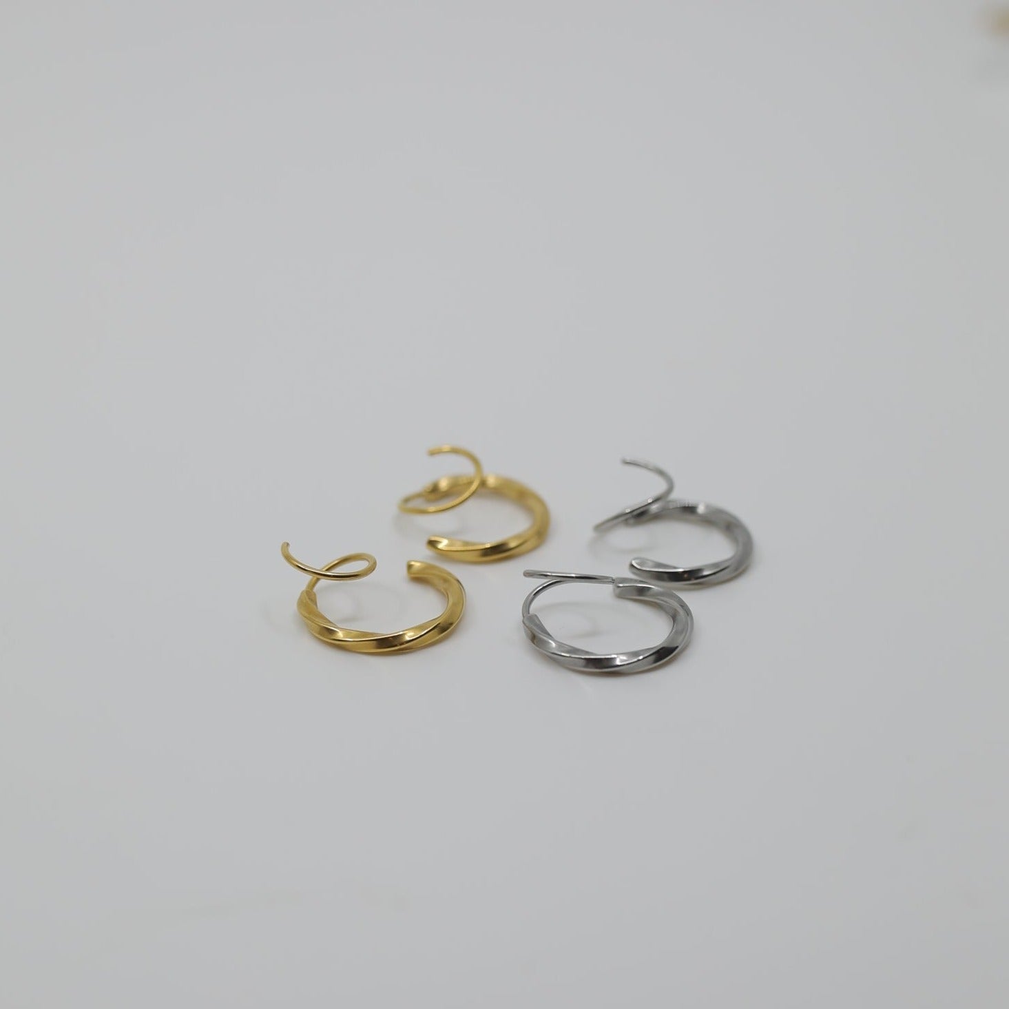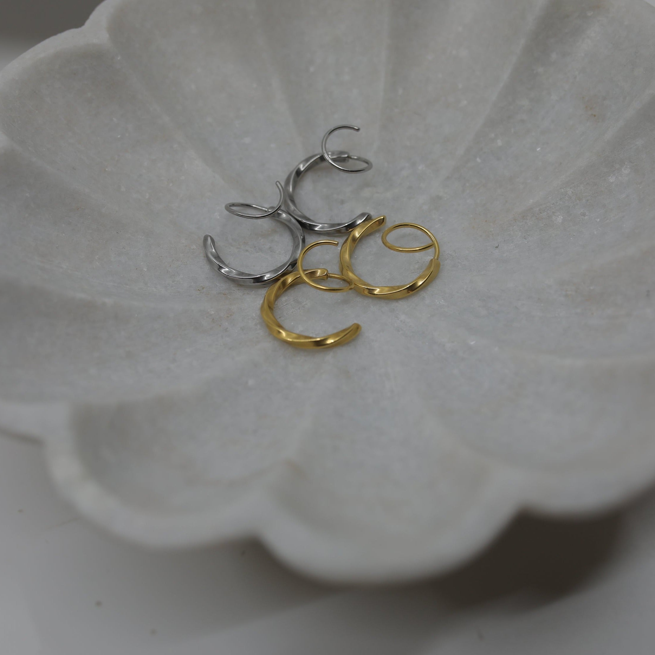 These twist earrings are a must! Twist them in and it's like magic! A double piercing with only a single hoop!